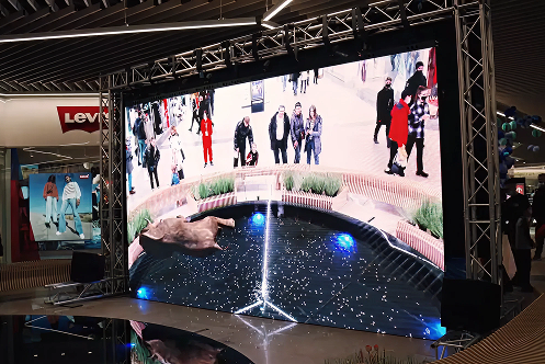 W przestrzeni centrum handlowego zainstalowano ekran z kamerą rejestrującą odwiedzających. Na ekranie wyświetlane są treści AR w postaci zwierząt 3D, które reagują na pozycję osoby i podchodzą do miejsca, w którym się zatrzymuje, tworząc efekt żywej interakcji.